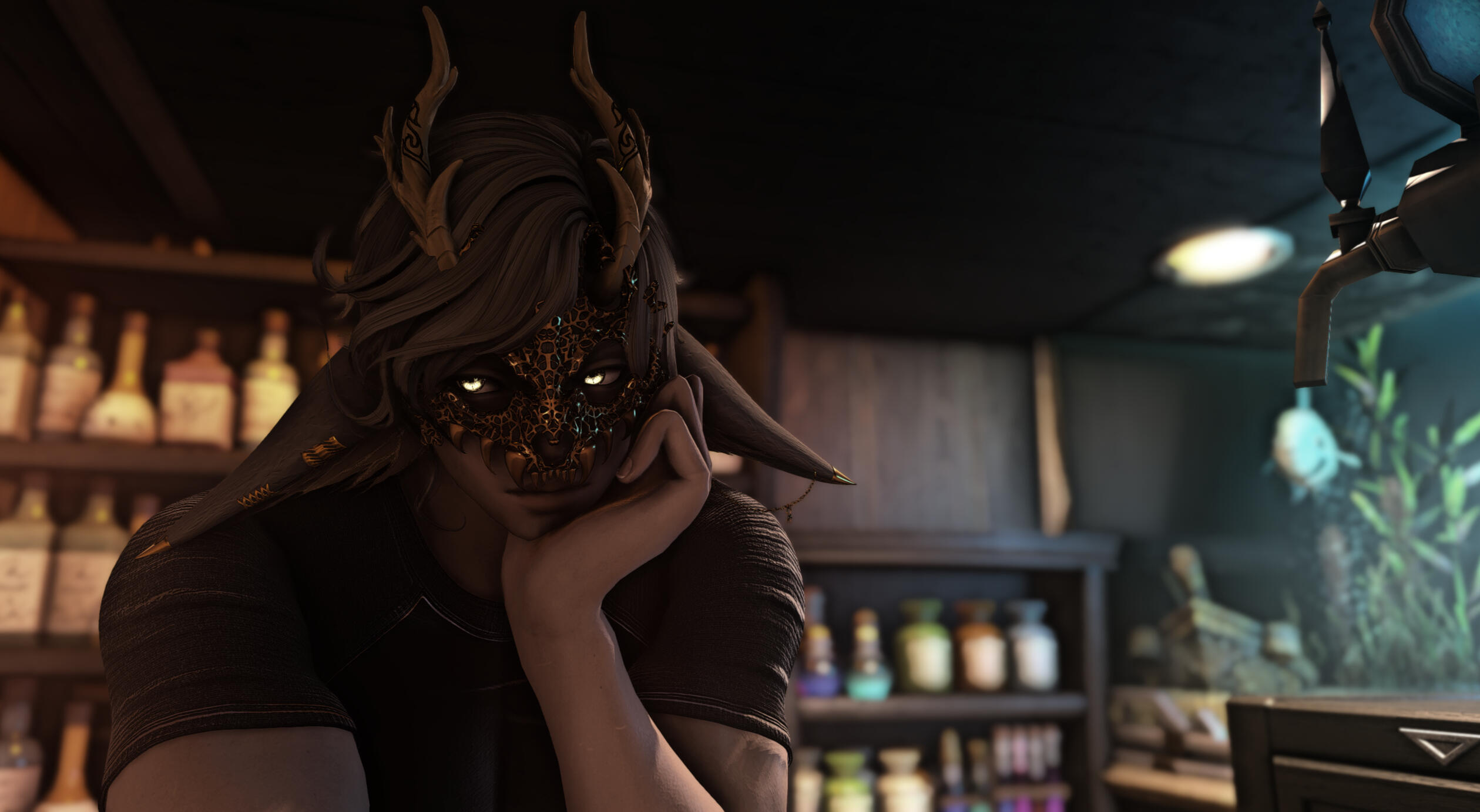 Even in the darkest of rooms a quiet calm still lingers at his shoulders, and a cowl of stoic solitude rests there. The looming Shshuye grits his fangs and scowls. A gilded jackalope skull does little to mask his sour visage, although his bitter demeanor would leak through either way.Not a fan of intoxicants, Zier's ventures into bars and taverns almost always come tied to a job. Professional and cold, he might excel in pleasantries but when pressed will shut down any ventures into his personal life.